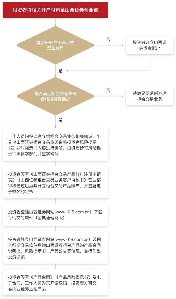 合格投资者签署《山西证券股份有限公司柜台交易客户风险揭示书》、《柜台交易产品账户注册申请表》、《山西证券柜台交易业务客户协议书》后,营业部即可为合格投资者开通柜台交易业务权限。